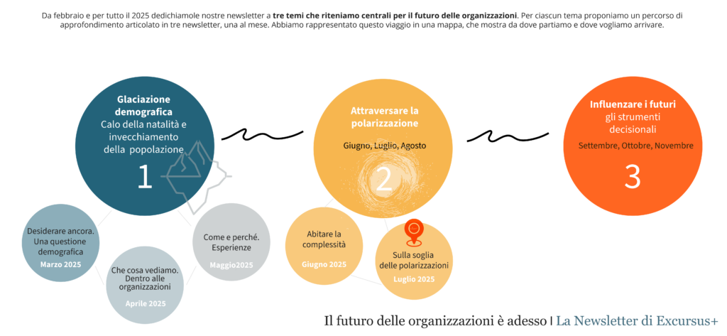 Da febbraio a dicembre 2025 dedichiamo le nostre newsletter a tre temi che riteniamo centrali per il futuro delle organizzazioni. Per ciascun tema, proponiamo un percorso di approfondimento articolato in tre newsletter, una al mese. Abbiamo rappresentato questo viaggio in una mappa, che mostra da dove partiamo e dove vogliamo arrivare.